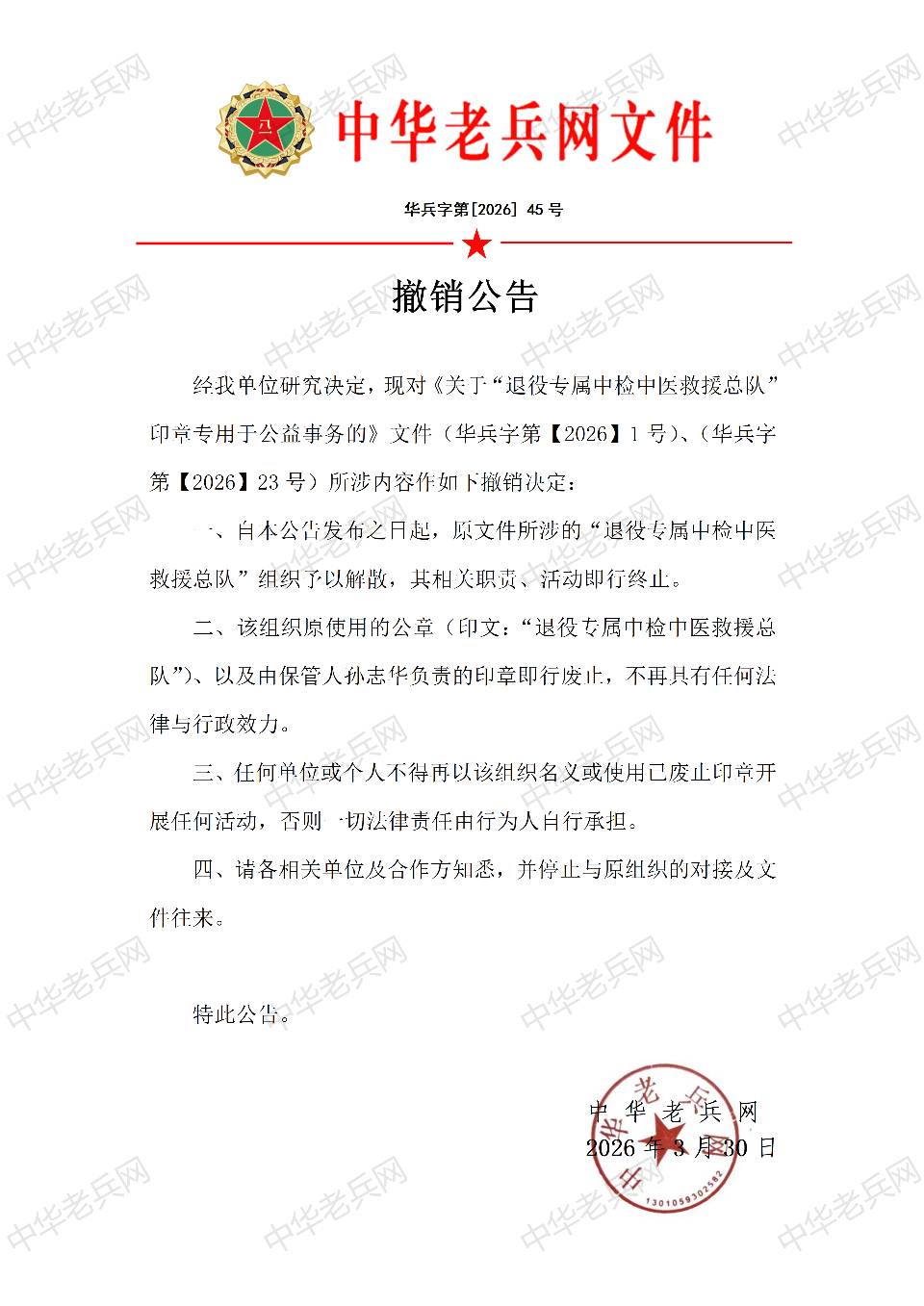 撤销“退役军人专属中检中医救援总队及公章公告!!!