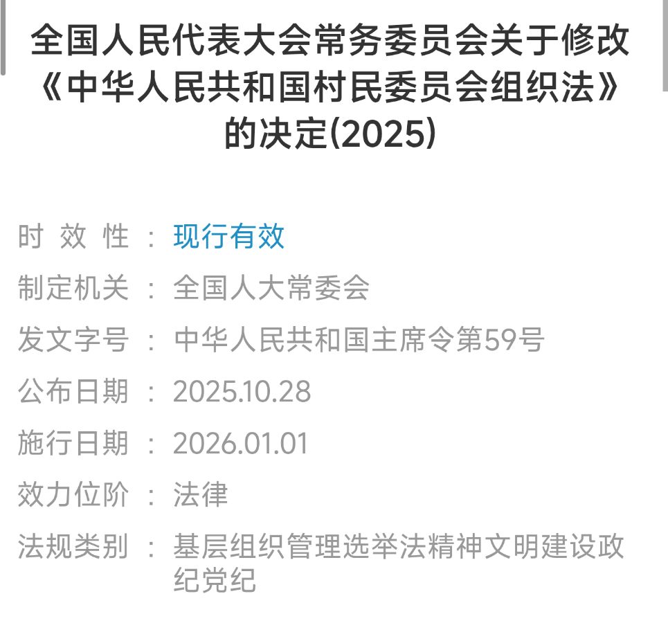 全国人民代表大会常务委员会关于修改 《中华人民共和国村民委员会组织法》 的决定(2025)/欧大鹏/ᥬ🌝᭄七台河头条