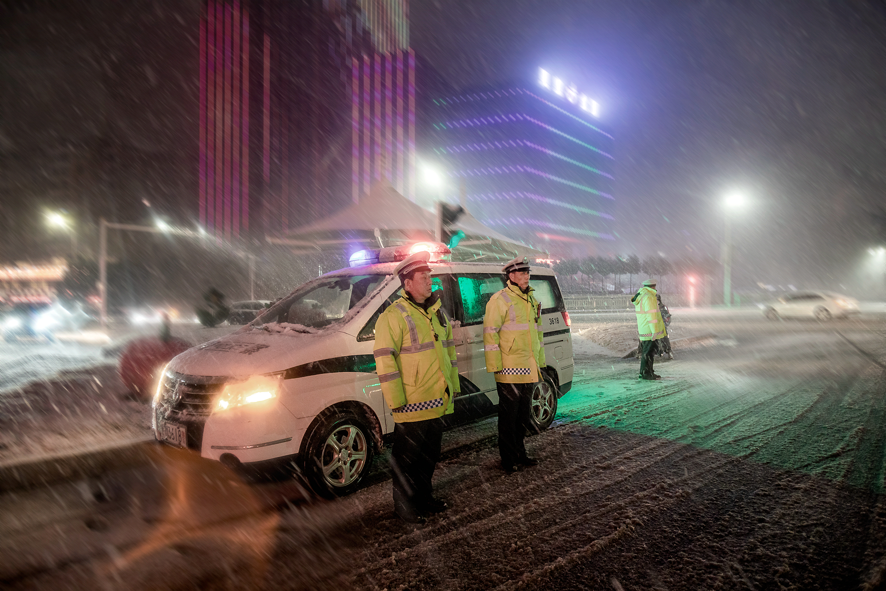 【图片新闻】河南灵宝交警强化雨雪天气路面管控