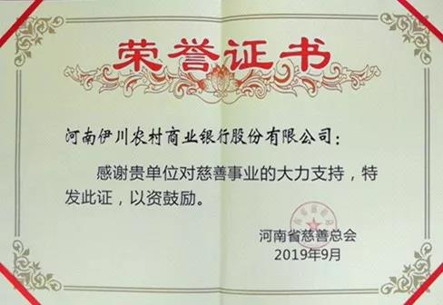伊川农商银行获评全省慈善会系统优秀爱心企业