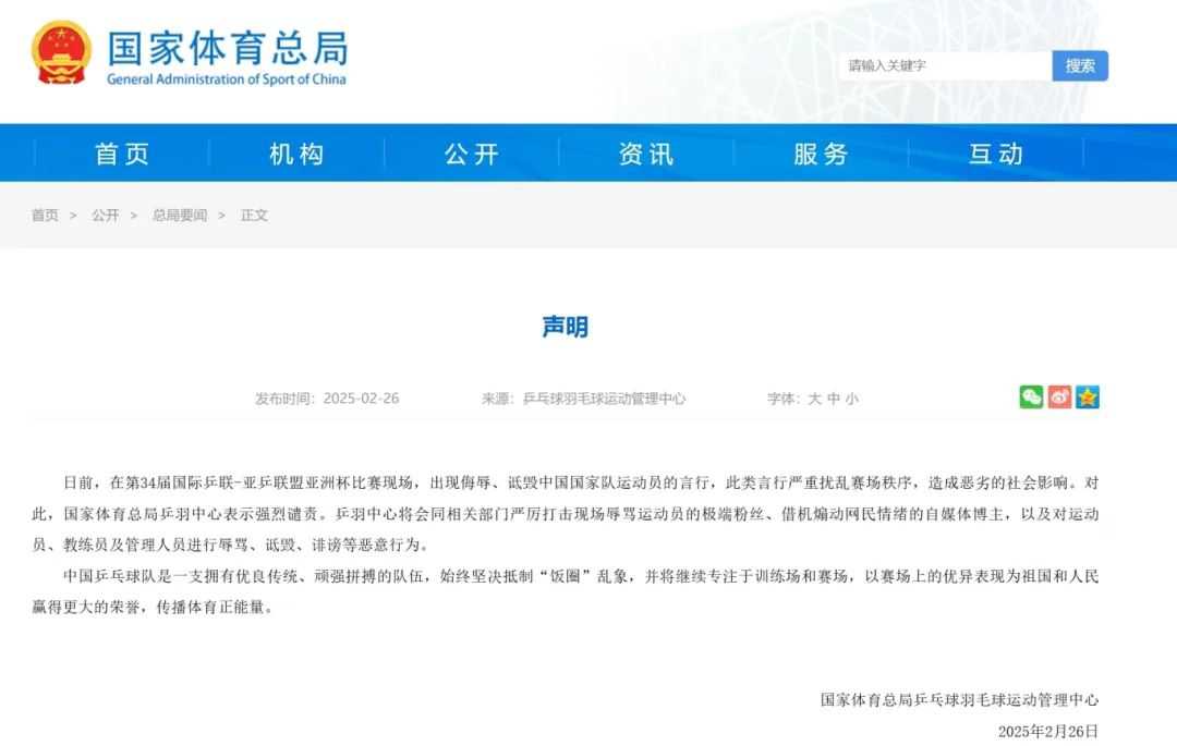国家体育总局乒羽中心声明:强烈谴责!