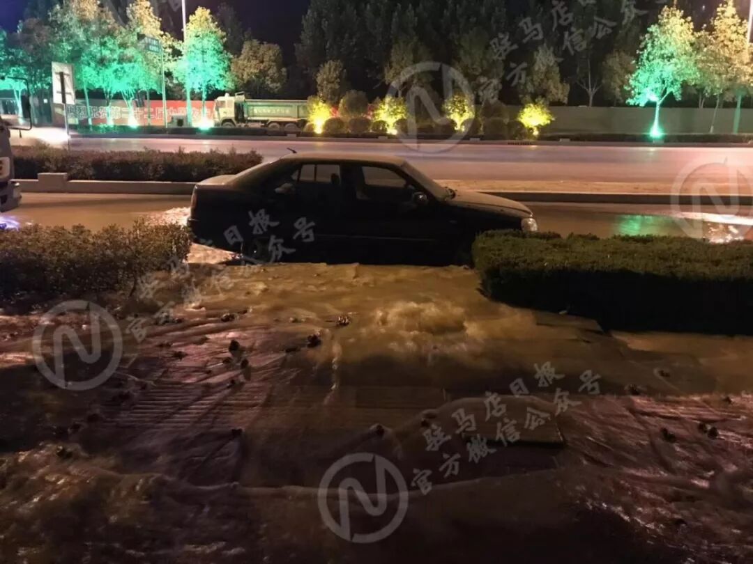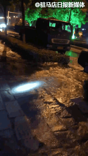 晚上六点多时,又有市民爆料称驿城大道与天颐路交叉口往北50米处发生爆管。记者赶往现场看到路面已经大面积积水,大量的水还在往外涌,有行人路过时只能趟水前行。