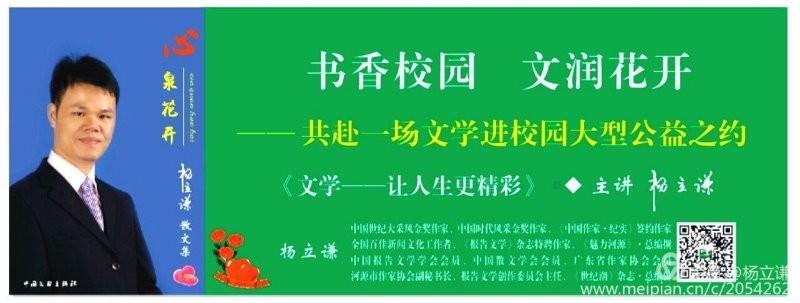 作者简介:杨立谦,大学中文系毕业。曾任报刊记者编辑,河源市文联《绿岛》文学杂志主编;现任《世纪潮》杂志总编辑,《魅力河源》总编纂。系中国散文学会、中国报告文学学会、广东省作家协会会员,《中国作家·纪实》签约作家,《报告文学》杂志特聘作家。著有《心泉花开》等7部专著。作品散见于《人民日报》《中国作家网》《中国作家·纪实》《作品》《南方日报》《羊城晚报》《新世纪文坛报》《青春岁月》《大鹏文学》《粤海散文》等报刊。有多篇作品被多家报刊转载并选入《中国当代散文精选》《中国散文诗年选》《高中语文阅读》《高考模拟试题》。作品在全国各类征文大赛中荣获30多次奖项。多次应邀出席北京人民大会堂颁奖大会。