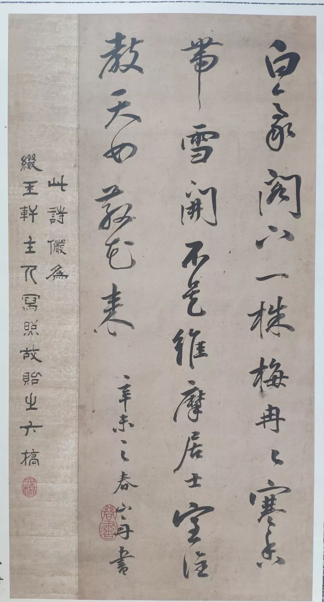 梁同书(一七二三—一八一五),与刘墉、翁方纲、王文治三家被誉为“清四家”。此幅行书所书的诗是《雪梅》,句中又有“天女散花”四字,切人切事,再巧不过,所以三多为了点明“借诗献梅”的缘由,又特意在左侧绫边题跋十六字,曰“此诗俨为缀玉轩主人写照,故贻之。六桥”。原幅梁同书题诗曰:“白毫阁下一株梅,冉冉寒香带雪开。不是维摩居士室,谁教天女散花来?”以诗印证,人事恰合,确实难得。此书法条幅,得归善处,后经梅府转藏于梅兰芳艺术纪念馆。