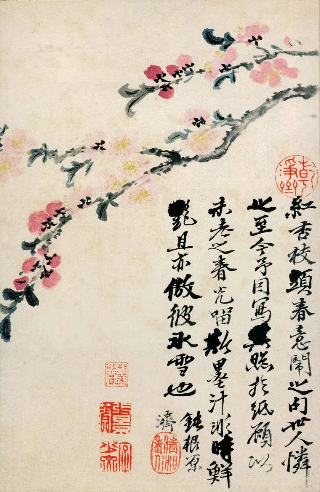上海博物馆藏清书画家原济《花卉图》,第二幅画斜枝春色,红花间叶,恐观者桃杏莫辨,便借北宋宋祁《玉楼春·春景》词句“红杏枝头春意闹”题于花下,一句点醒,谢绝他想,堪叹巧妙。明陈继儒乃诗书画兼擅的大家,上海博物馆藏其一幅绢本立轴,画艺精湛;上半幅梅枝倒垂近水,下半幅画流波激石,上下呼应恰得。陈公随手借盛唐戎昱《题梅》名句“不知近水花先发,疑是经春雪未消”,以草书题于梅枝之右上,俨然同一机括,岂止不觉是借,若无七百年时空之隔,真信戎昱《题梅》诗只为此画而生。