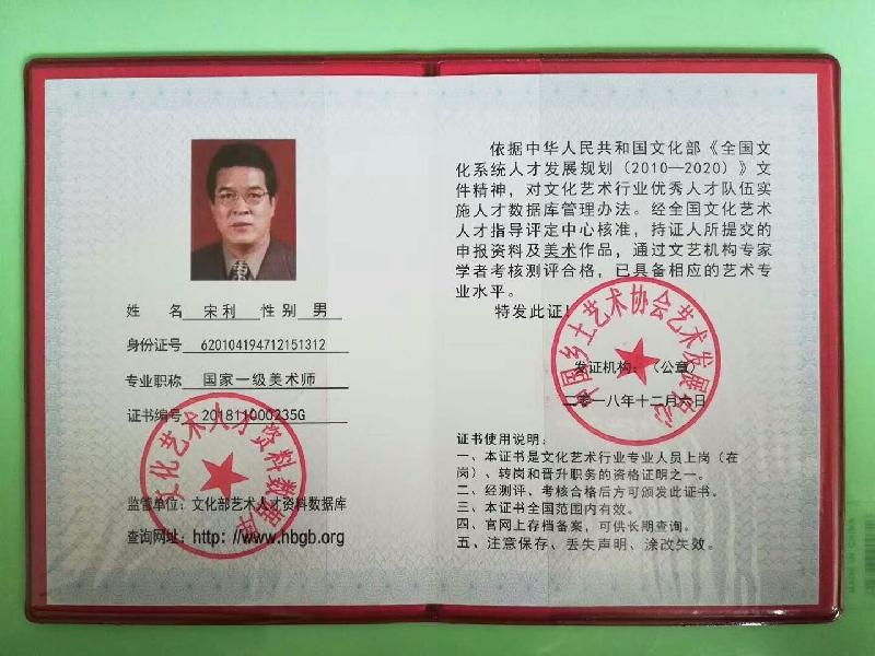 宋利,字中文,号宝木,汉族,中共党员、大专学历,国家一级美术师。本人自幼喜爱美术,初中在北京少年宫学习素描三年,退休后在甘肃省老年大学学习人物画和山水画。分别是:甘肃省美术家协会会员,甘肃省科技界书画协会会员,甘肃省老年书画协会会员,兰州市老年书画协会会员,甘肃丝绸之路协会会员,纪录网中国书画研究院院士,陕西省电力美术家协会会员,甘肃大千画院院士,无锡锡梅诗书画院常务理事。
