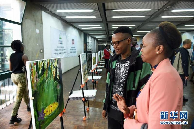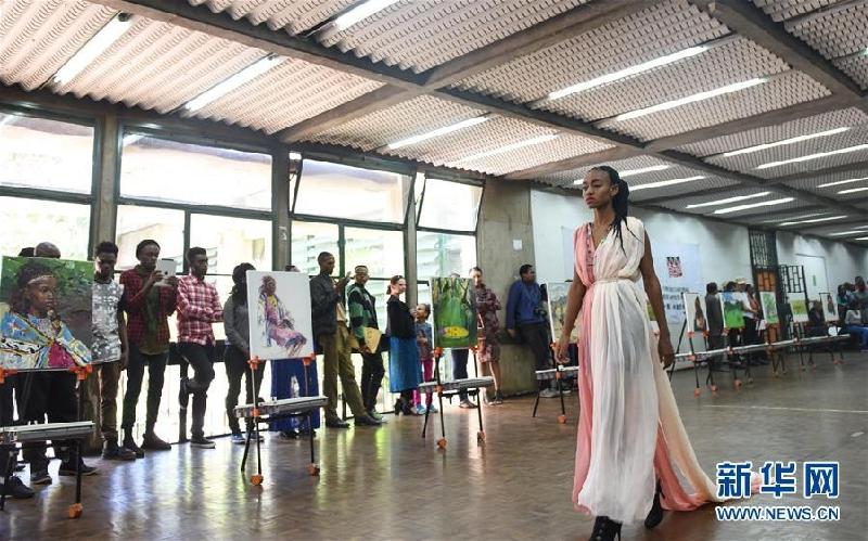 图为肯尼亚人们欣赏中国绘画家作品、中国设计师流行服饰。