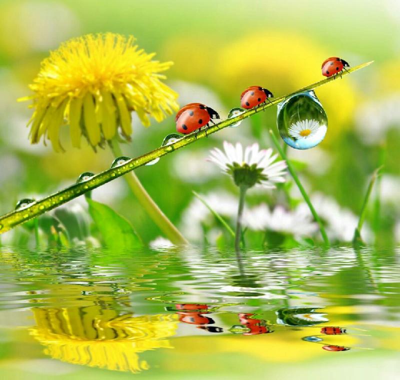 踏着绿茸茸、亮晶晶、笑盈盈的草坪,