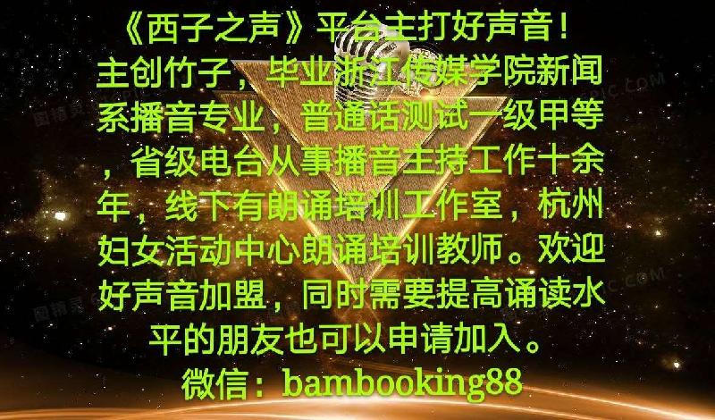 主播:安好,西子之声平台主编。 全悦大同阅读会阿紫花开朗诵艺术团成员,热爱朗诵,用声音感受文字的魅力;钟情于瑜伽,在一吸一呼之间体悟当下的感觉;喜欢跳舞,跟随音乐的节拍随心舞动;喜欢身心灵方向的探索,做一个眼里有阳光、心中有爱,能够滋养自己、温暖别人的人。