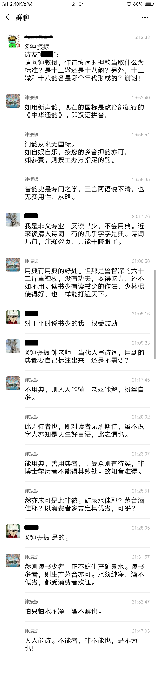 欢迎楼友们继续在公众号专辑后面,留言您想请教钟教授的有关诗词方面所有问题。答案会在本刊陆续公布。另,此辑是属于钟教授的个人专辑,如您觉得内容不错,点赞红包会入钟教授专辑专用帐户。钟教授语,读者关注阅读就是支持,赞赏的红包,都用于赠书(钢笔字诗词,书,刊……)。投桃报李,非以为报也,永以为好也!请赞赏钟教授专辑的诗友们加小编微信号15021309959,小窗赐知地址,以便邮寄。