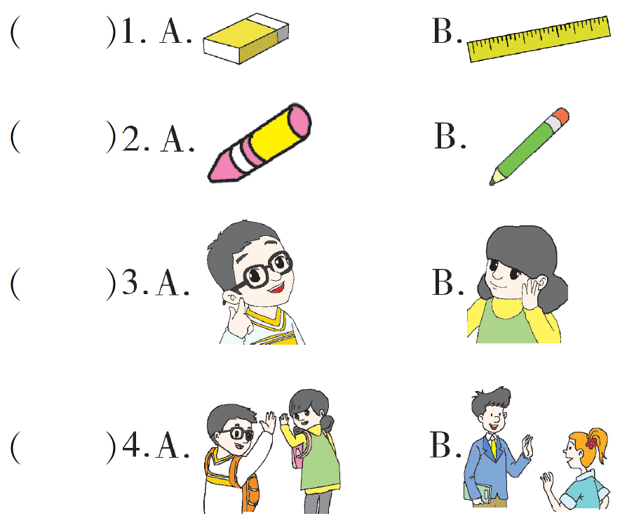 难点:学会询问对方的名字四会单词短语:ruler尺子pencil铅笔eraser橡皮crayon蜡笔bag包pen钢笔book书pencil box铅笔盒三会单词短语:no不 your你(们)的惯用表达式:Hello! 你好! Hi! 你好 Goodbye! 再见! Bye!再见 Me too! 我也是重点句式或句型1.介绍自己的句子。I'm+其他(Amy,seven,short...)例:Hello,l'm Wu Yifan.你好,我是吴一凡。2.表达“我有一个/块/只/…”的句子。I have a/an+物品(pen, ruler, eraser...) 例:I have a ruler.我有一把尺子。3.询问对方名字的问句及其答语。问句:What s your name?答语: My name is+名字.例:-What's your name?你叫什么名字?-My name is John.我叫约翰。了解句型1.-Hello,I'm Miss White.你好,我是怀特小姐。-Hi,I'm Sarah. 你好,我是萨拉。解读: hello和hi都表示“喂;你好”,是人们打招呼时的常用语。2. Are you Tutu? 你是图图吗?解读:这是用于猜测对方身份02.听力练习