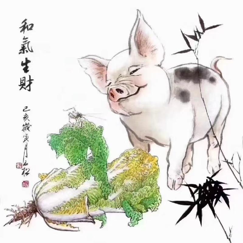 猪拱白菜遇百财,福禄双全平安宅。