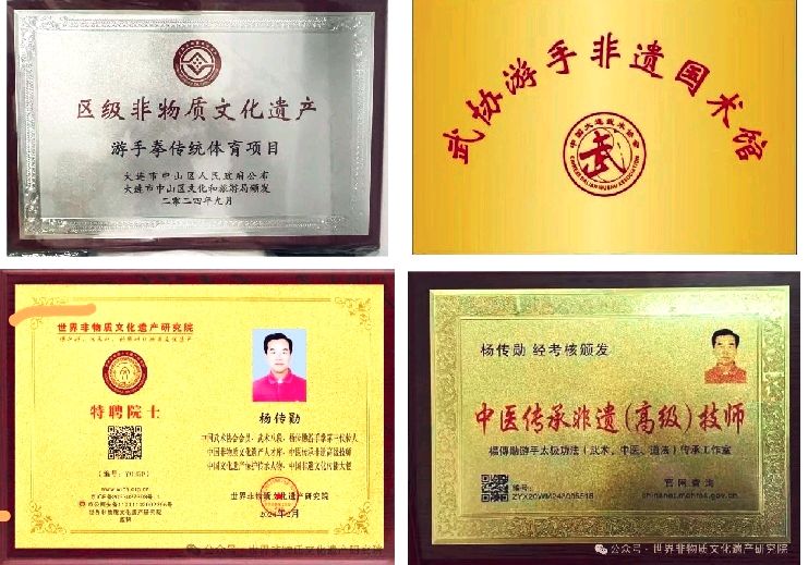 杨传勋 : 非物质文化遗产项目游手拳代表性传承人大连市武术协会会员,中国武术协会会员,武术一级教练。《武协游手非遗国术馆》馆长中医传承非遗(高级)讲师。2021年杨传勋先生游手拳获得《中国文化遗产保护传承人物》牌匾。