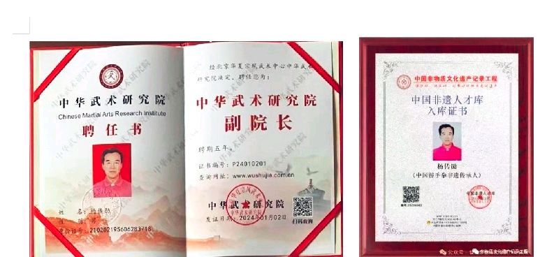六十载习武弘扬中华武术文化,游手拳习修精研挖掘整理推广神功大成! 游手拳是集武术、中医、道法相融合的一门道家拳法。 2023年杨传勋游手拳还获得《中国非遗文化传播大使》荣誉证书和《中国非物质文化遗产人才》入库证书。2023年被中国非物质文化遗产记录工程授予《中国当代武术家》称谓2024年被特聘为《世界非物质文化遗产研究院特聘院士》。2024年 被聘为《中华武术研究院副院长》。2024年被中国武术家联合会聘为《中国太极拳技术等级指导委员会专家评委》2024年政府文旅局批准并颁发杨传勋《非物质文化遗产项目游手拳(武医道)代表性传承人》的荣誉牌匾。2024年年末所著作品《游手拳》尚待发表。