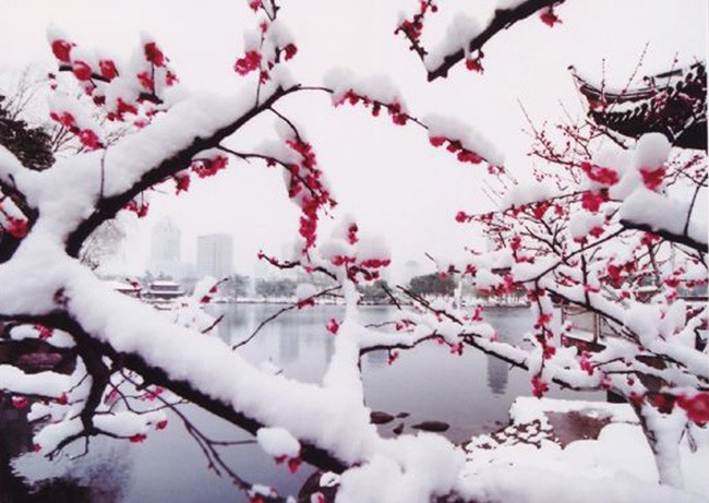 风扫寒冬落雪乡,凌包梅蕊傲苏霜。