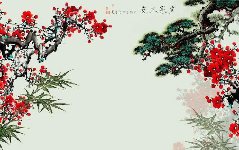 百花思动,三友知闻。盼寒相聚,诗来染,福敲门。