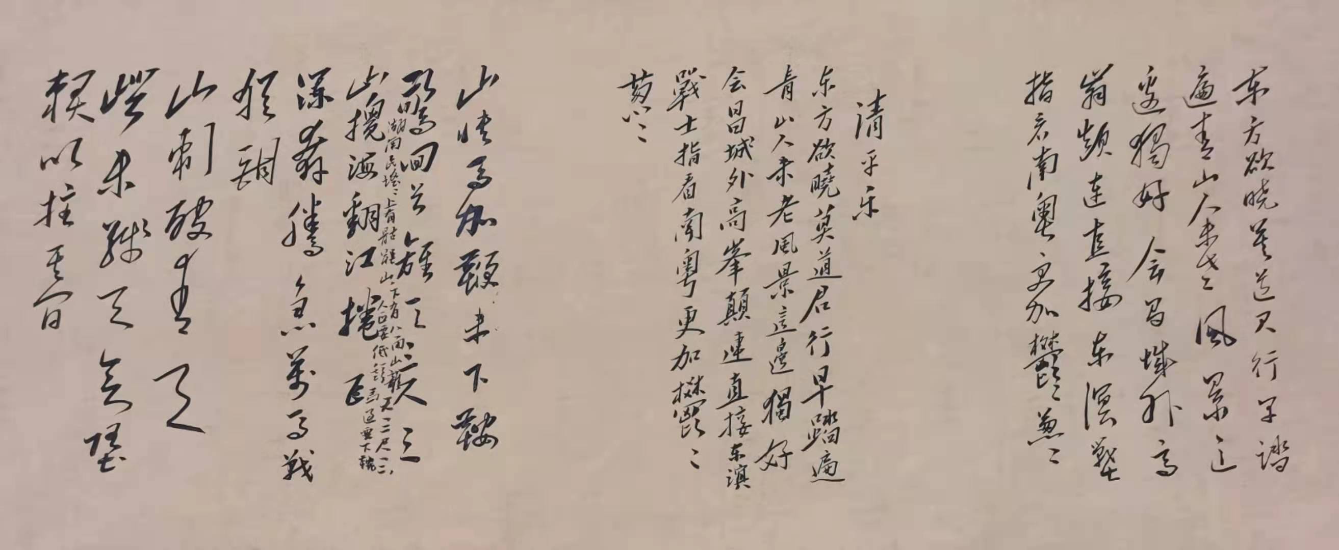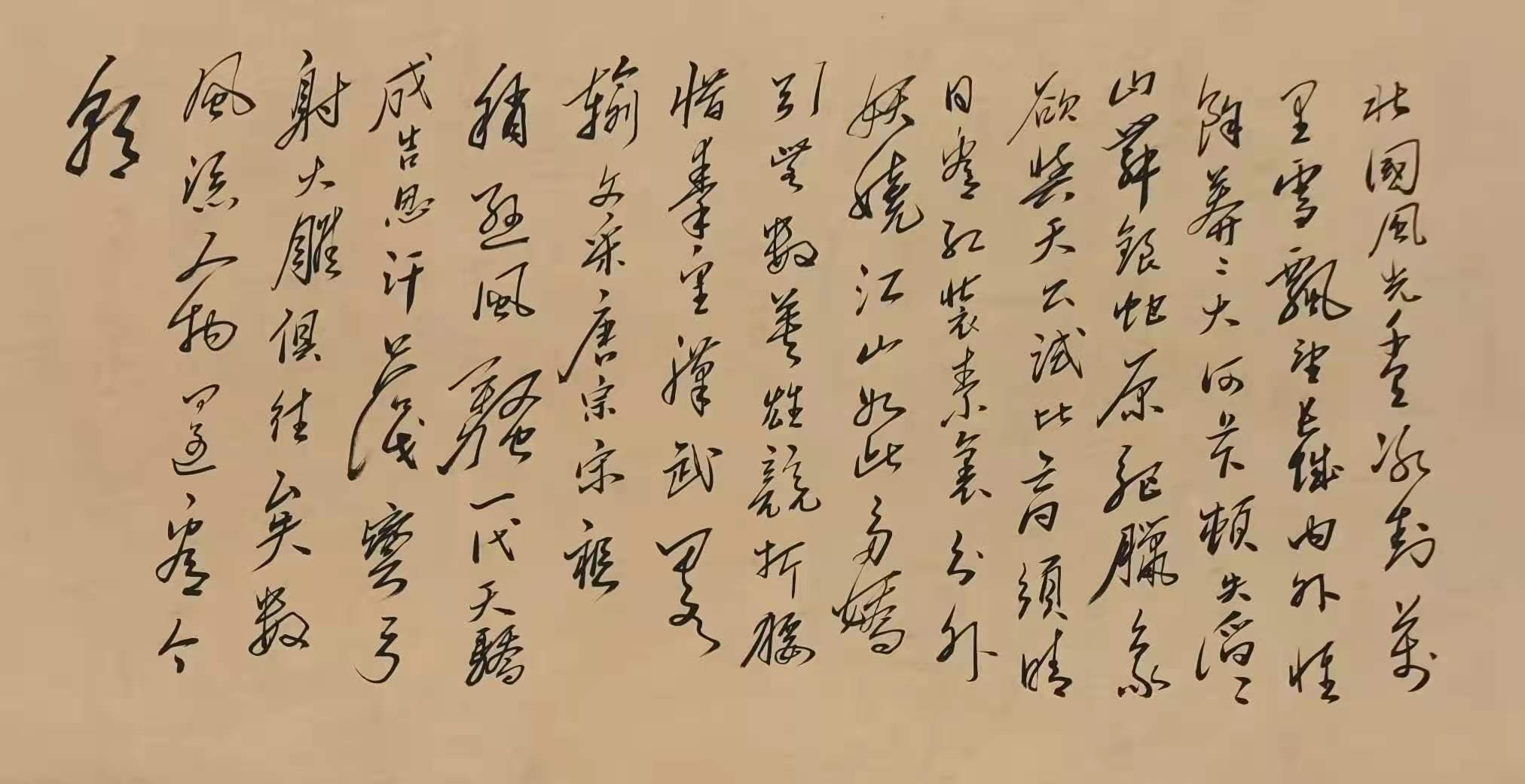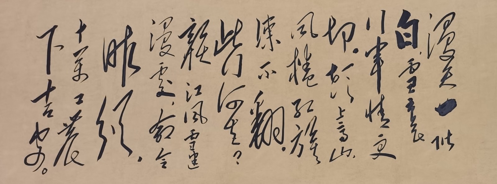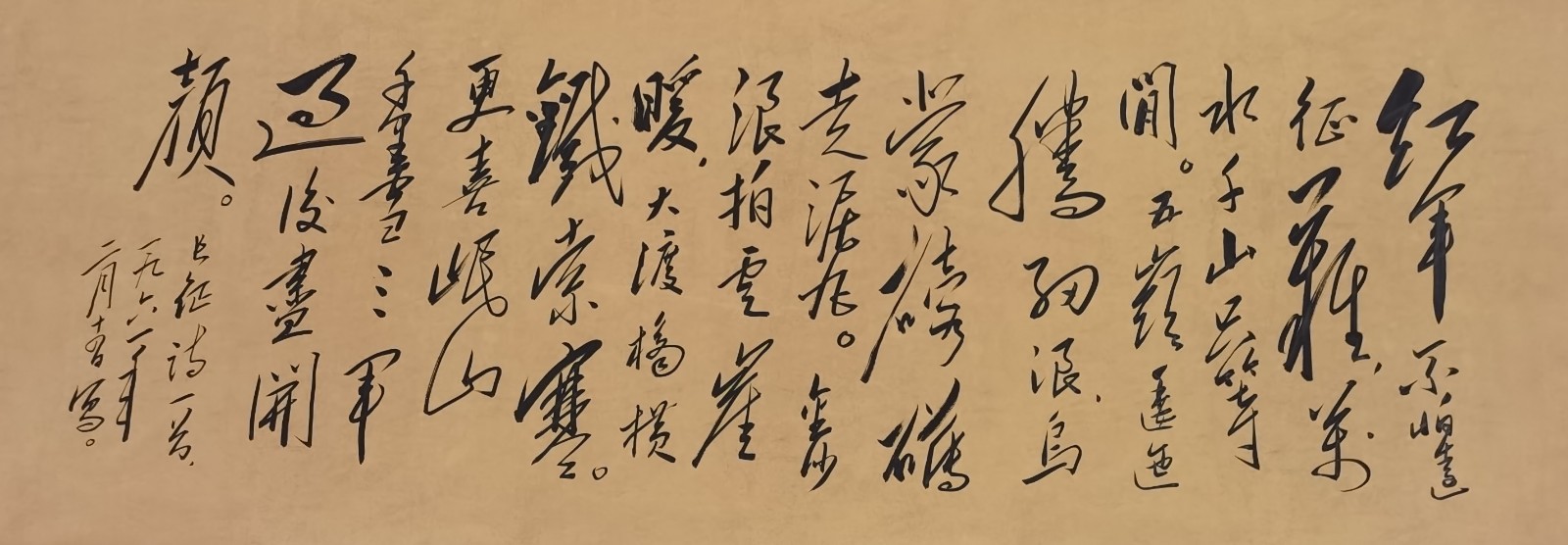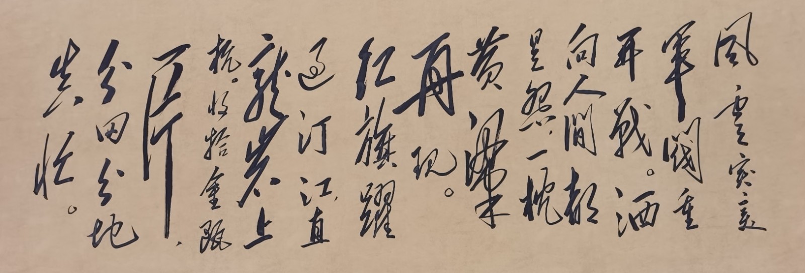 这次展出的毛泽东诗词书法作品百米长卷和12幅单幅书法作品,是刘般伸先生根据1997年4月中共中央文献研究室、中央档案馆编辑出版的《毛泽东诗词手迹》用毛泽东书体精心创作,覆盖了毛泽东1921年至1966年间创作的四十二首作品,他严格按照毛主席原作进行书写,即使是原作中涂抹改动之处,也力求保持原貌。在这幅幅百米长卷中,既体现出了整体统一,又表现出了每一幅作品的独立完整和不同的表现手法,既可以百米长卷整体收藏,还可以裁剪分开成为独立作品。