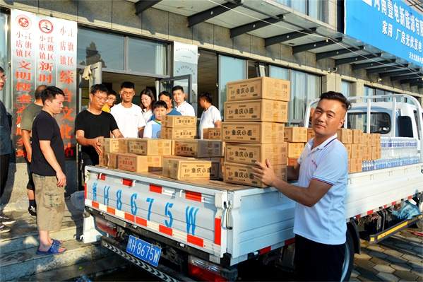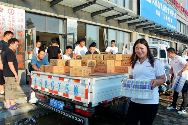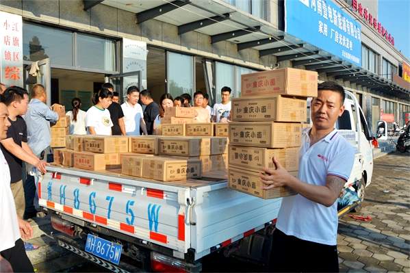 7月24日,星期六《丽莎轻奢》洛阳中小企业家协会副会长、山东丽莎美有限公司河南省总代理负责人李聪聪带领员工利用休息时间顾不上吃饭、休息,开车几百公里到新乡市红旗区小店镇为灾区群众捐赠了矿泉水、重庆小面等生活物资,奏响人间大爱。