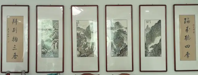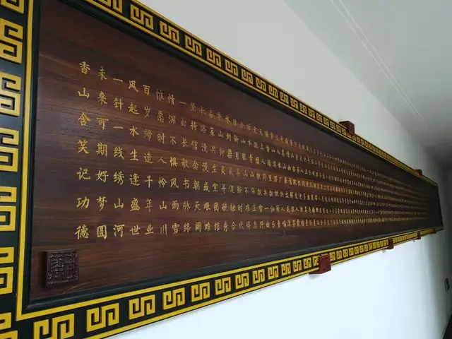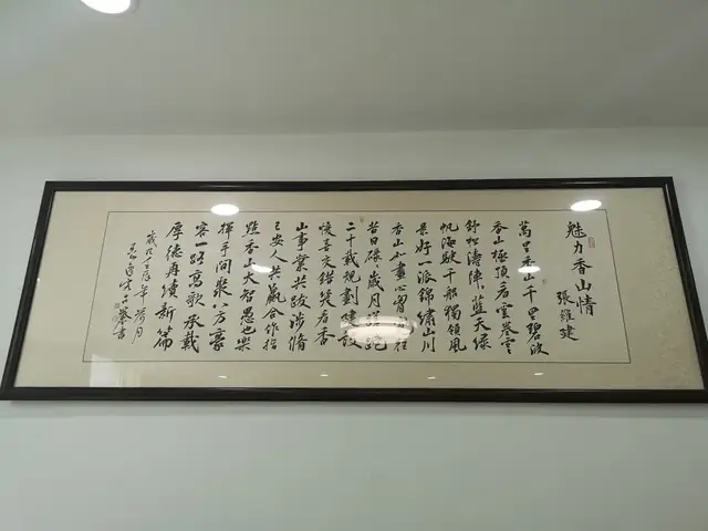 步入门厅,最抢眼的是一楼的《香山史诗》,长长的木制牌匾和镂刻的笔画带着厚重感,把香山故事描绘成诗。走廊两边墙壁上,党建文化做得新颖有趣。三楼有独立宽敞的书画室,案上毛毡墨迹斑斑,不知多少文人在此留下墨宝。四周壁上挂着的书画,无一例外都与香山有关,连镇纸也取材于香山石块,楼主对香山之热爱,处处可见。