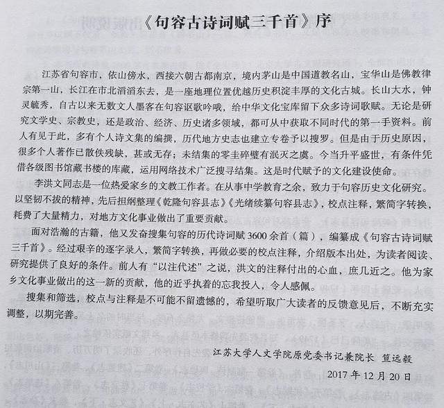 江苏大学人文学院原党委书记兼院长笪远毅教授《句曲诗综·序言》。