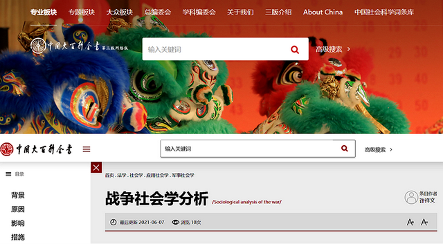 “找最合适的人写最合适的条目”,这是《中国大百科全书》第三版邀请撰稿人的原则。在此原则指导下,2016年,大百科三卷编委会主动约国防大学南京政治学院教授许祥文参加《中国大百科全书》第三版的《军事社会学》及相关的词条撰写工作,给许教授下达了10条撰写任务。现已上线9条,其中《军事社会学》领条仍在编审中,待上线。