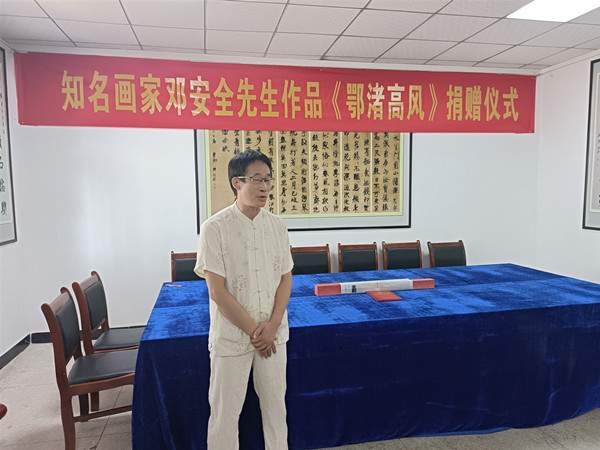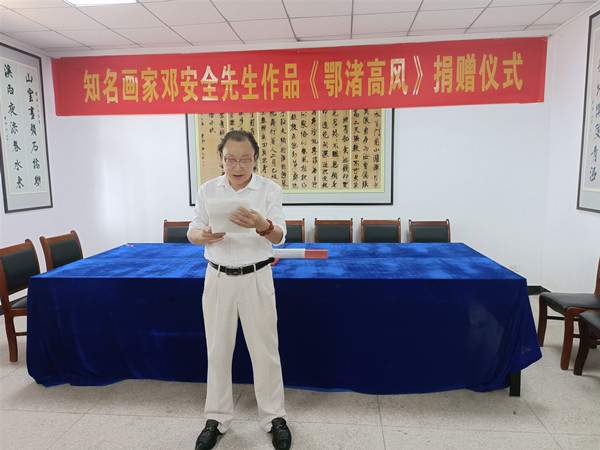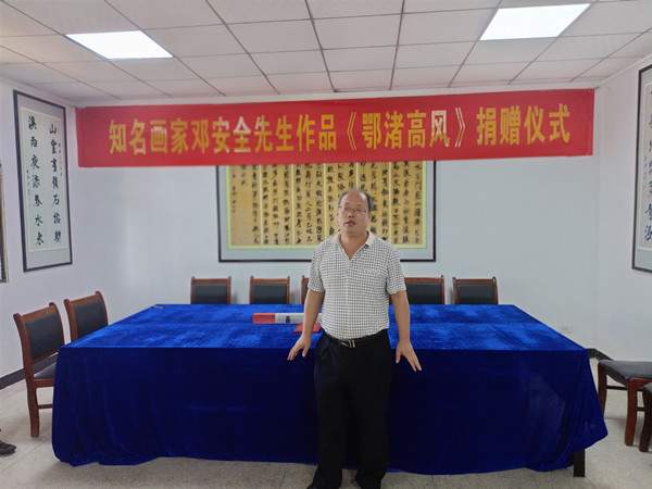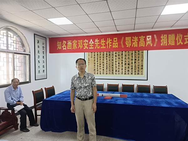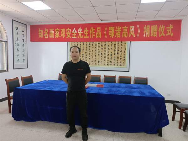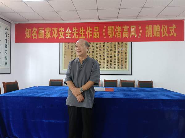 鄂州市民间文艺家协会副主席邓安全景仰前辈的艺术成就和人格风范,潜心创作焦墨画作品《鄂渚高风》,并代表鄂州市民间文艺家协会捐赠给张裕钊书法文化博物馆。