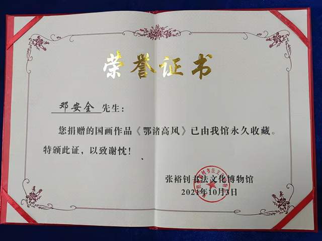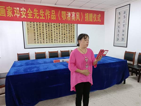 惠风和畅秋高气爽,墨韵书香群贤毕至。2021年10月3日,鄂州市民间文艺家协会副主席邓安全的作品《鄂渚高风》捐赠仪式在张裕钊书法文化博物馆举行。张裕钊书法文化博物馆馆长张绍银主持仪式,并对邓安全捐赠作品致以感谢,并颁发收藏证书。
