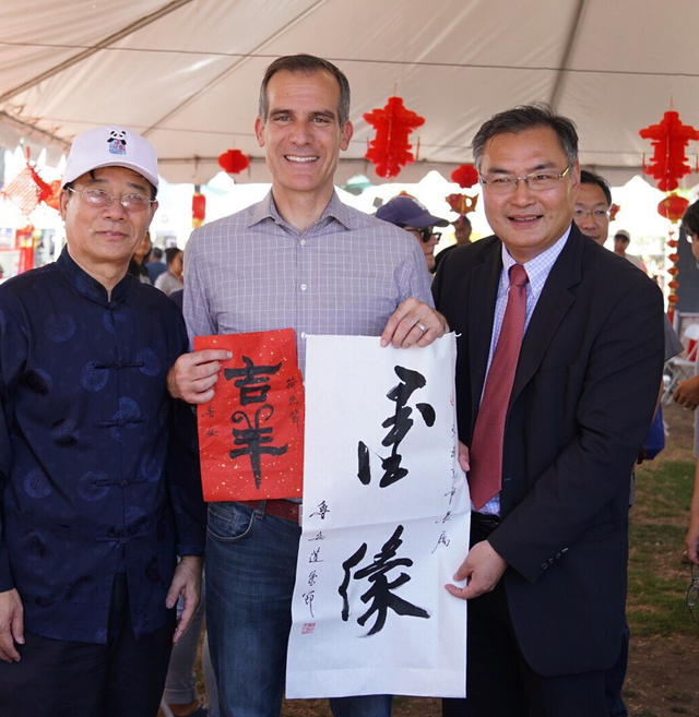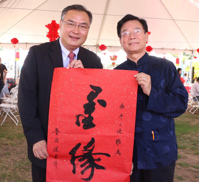 (圖7 魯安作品在美國蓮花節上贈送給中國駐洛杉磯總領事張平先生和洛杉磯市市長傑西緹先生)