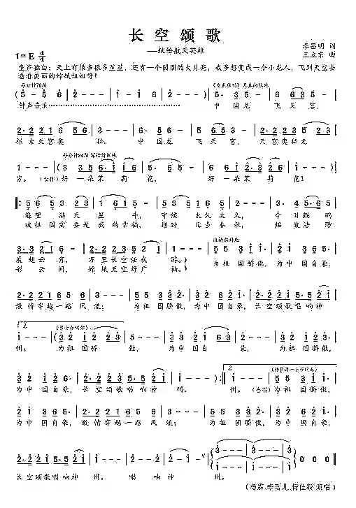 在庆祝中国共产党建党100周年及神州13号航天员飞行乘组发射启程之际,为展现当代“空间科技长城”和“航天事业”的伟大功就,赞美、讴歌和塑造当代英雄——航天英雄,充分发挥音乐作品主题宣传和导向传播的作用,给人民群众传递航天英雄的正能量,提振和凝聚民族精神,进一步传承和弘扬中华民族优秀传统文化,更好地促进军民融合和拥军优属工作。由中国长城学会携中国传统文化促进会、中国老龄事业发展基金会、海南省康养旅游协会等单位联合组织优秀创作力量创作了赞美航天英雄的音乐作品《长空颂歌》(作词:李昌明、作曲:王立东、演唱:杨霖 李雨儿 杨佳凝),并于近日制作成“航天主题音乐电视片《长空颂歌》——致敬神州十三号航天员飞行乘组”。该作品激情豪迈、充满爱国主义情怀和时代风貌,深情歌颂了中国航天事业取得的辉煌成就,“今日鲲鹏展翅云霄,万里长空任我游,为祖国骄傲,为中国自豪,激情穿越一路风流!”歌词激情礼赞航天健儿的威武与自豪;旋律巧妙地把歌曲《东方红》《茉莉花》的音乐元素作为引子和间奏,全曲激昂温馨,韵味盎然,催人奋进。