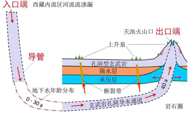 长白山天池构成一个典型的深循环地下水连通器:火山口为出口端,入口端位于西藏裂谷带,导管位于岩石圈中。同位素分析确认,长白山天池瀑布水与当地降水存在明显差异,而与羌塘盆地丢失的部分水之间存在“父子关系”。“导管”是由熔岩流演变而来的,岩浆活动停止后,岩石圈中的熔岩流停止流动,熔岩受围岩影响下降,熔岩在冷却成岩的过程中形成的收缩缝,最终演变成为地下水的导水通道。最初的深循环地下水为高温热液,随着围岩被冷却,瀑布水温度逐渐降低,现在已经降低为常温。
