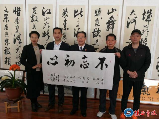 咸阳宗彪书画艺术中心院长张宗彪(中)、副院长郭豫雄(右二)、院办主任胡言玲(左一)和本刊总编许衙评(左二)、副总编杨海卿(右一)合影。