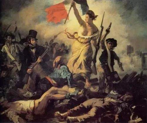 反映1830年法国革命的《自由引导人民》是德拉克洛瓦最具有浪漫主义色彩的作品之一。画家以奔放的热情歌颂了这次工人、小资产阶级和知识分子参加的革命运动。高举三色旗象征着自由女神的妇女健康、有力、坚决、美丽而朴素,正领导着工人、知识分子的革命队伍奋勇前进。象征自由的女神的左侧,是少年英雄阿莱尔。右侧的大学生,就是画家本人。