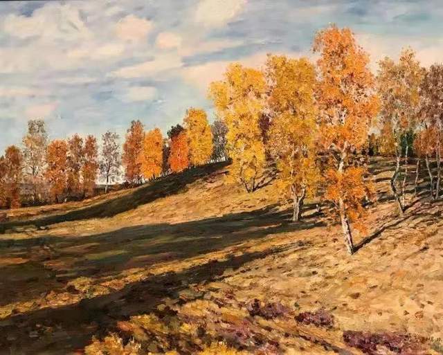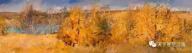 此次活动中美术界老前辈靳尚谊、中国美协主席、中央美院院长的范迪安响应总书记的号召,怀着对林场建设者的崇高敬意和对这片绿色净土的渴望,奔赴塞罕坝开展写生活动。范迪安老师的作品《秋的乐章》像一部浩大交响乐,金黄色的落叶松占据了三分之二的画面,像弦乐唱响了金色卫士,金色丰碑的主旋律。远处的湖水和白桦像管乐清脆、流畅、嘹亮。曲调表现了塞罕坝人的艰苦卓绝,激扬向上的精神。每颗落叶松都代表着一份坚强,一份果敢,一份辛劳。作品主旋律明亮、坚实、层层递进,各种和弦饱满、圆润、相得益彰。