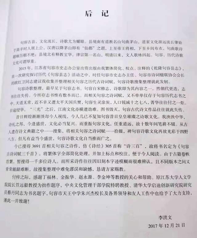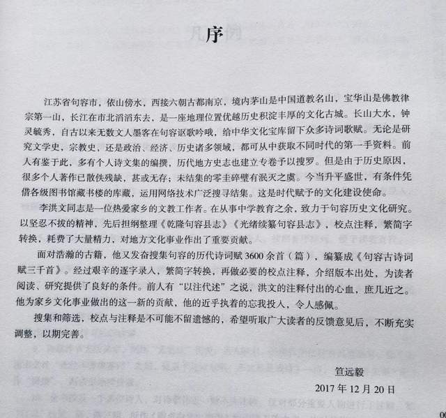 2017年12月20日江苏大学人文学院原党委书记兼院长笪远毅教授作《句容古诗词赋三千首》序言