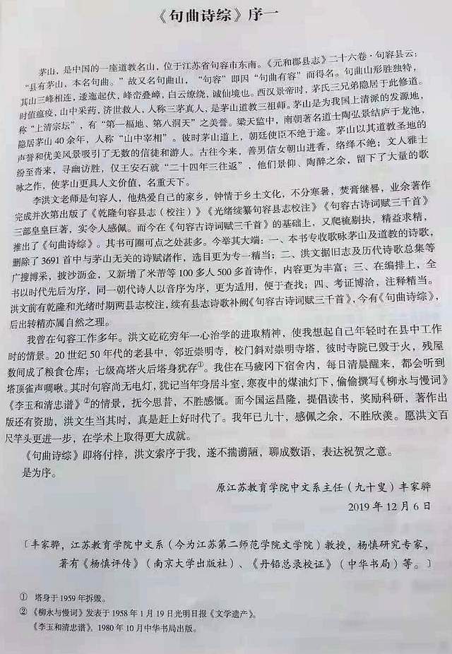 江苏教育学院原中文系主任丰家骅教授《句曲诗综·序言》