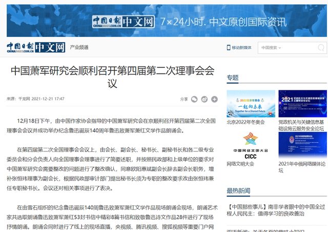 中国日报网:中国萧军研究会顺利召开第四届第二次理事会会议