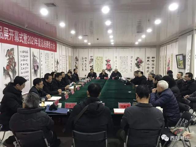 会上执行院长高万意作2021年度工作总结报告;高院长总结了2021年工作中的十大亮点: 亮点1:成功召开6次院委扩大会议。亮点2:严密组织了6次“送书画进万家”活动。 亮点3:高规格组织了3次专题书画知识公益大讲堂。 亮点4:开展了以【战“疫”有我,翰墨人在行动】为主题的书画作品网络展和书画名家作品展览等三个专题网络展、以及由麦积区文体广电旅游局、麦积区文学艺术界联合会主办,麦积区美术馆、麦积区美术家协会承办,甘肃分院协办的麦积区美术作品展等大型展览。亮点5:发挥甘肃分院成员的艺术特长和资源优势,积极开展变现创收工作。 亮点6:艺术点亮人生,翰墨成就未来。高标准落实“双休日笔会”交流活动和“月固定活动日”。亮点7:坚持线上线下结合,全方位打造全新的书画品牌。利用新媒体平台发布活动信息,展示画院风釆。 亮点8:大力开展榜样的示范效应,亮点9: 积极参与各种征稿活动。 亮点10: 爱心传递,正能量爆棚。这十大亮完美诠释了甘肃分院的工作。