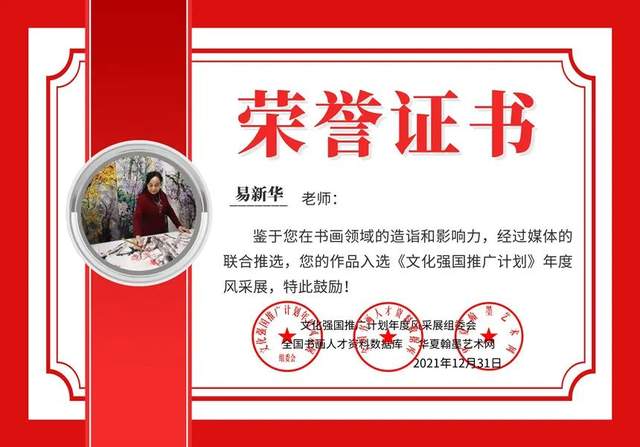 (14)国画作品荣获2021年“四海杯"海内外诗联书画邀请赛“金奖"并授予“新时代中华文化践行者"荣誉称号。