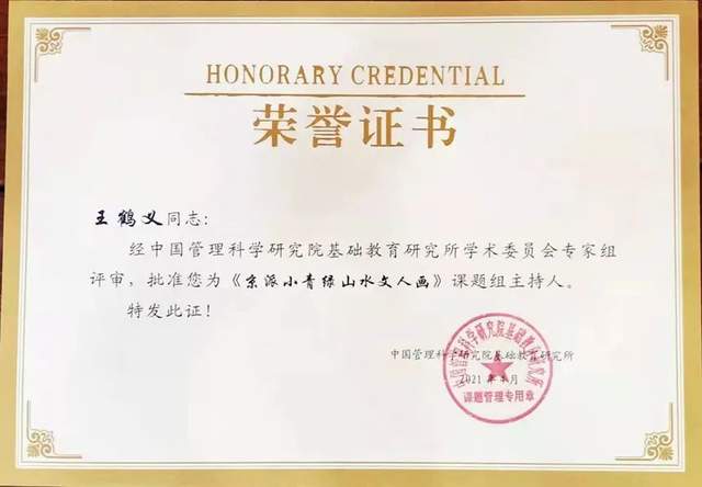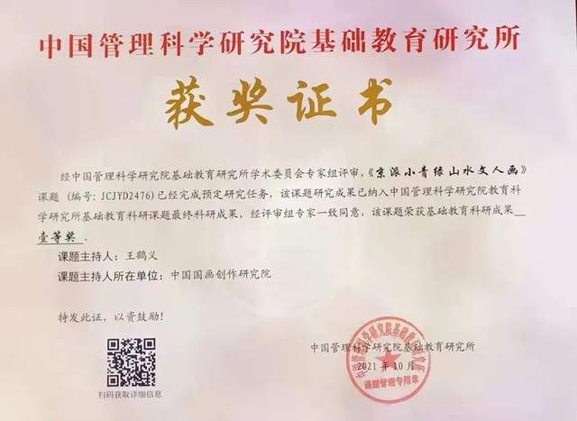 2021年,京派小青绿山水文人画已经被中国管理科学研究院教育研究所作为基础教育科研“十四五”规划重点课题立项,现在已经结题。科研成果及论文发表在中国管理科学研究院教育科研所的官网上及中华数据库和知网数据库上。