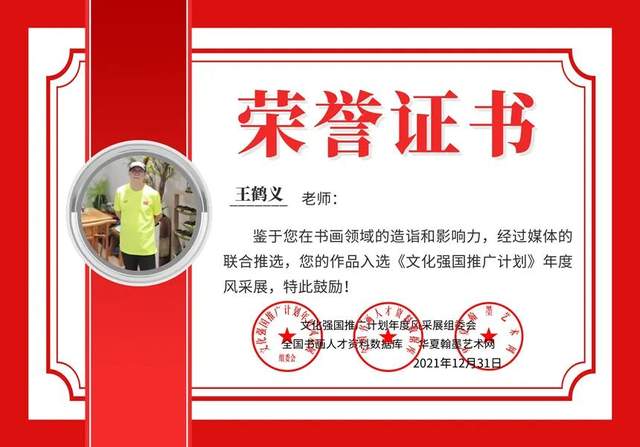 多部作品也收录到《中国书画艺术年鉴》《新中国美术图鉴》《新中国美术年鉴》《中国美术选集》《中国美术年鉴》《名家档案—走向国际的华人艺术家》《世界美术家大辞典》《70年70家艺坛丰碑》等多部大型美术史类图书。是《中国美术年鉴》《新中国百年艺术追梦人》的编委。王鹤义老师的诗歌作品入编《中国当代诗歌大辞典》《中国当代诗歌典籍》《40年文创选粹》等多部诗歌大典。也是书的编委。王鹤义是歌曲《观音赞》《观音莲》《元上都之歌》《禅心看风雨》《云锦之歌》《大爱无疆傲苍穹》《冬奥会之歌》的词作者。王鹤义老师是集文学,诗歌,书法,绘画为一身的新时代艺术家。