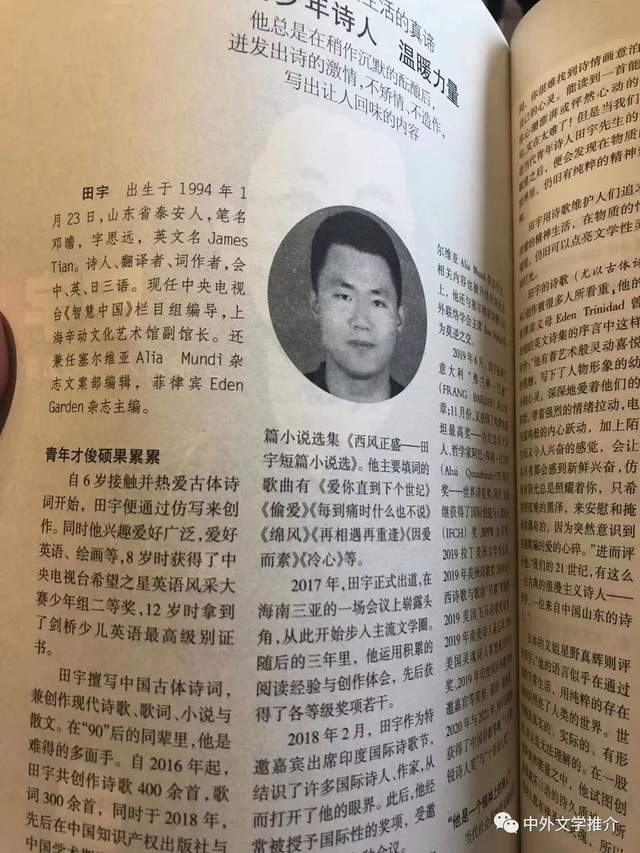 Tian Yu, born on January 23, 1994 in Tai'an, Shandong Province, has a pen name of Deng Zhan, and an English name of James Tian. Poet, translator, lyricist, can speak Chinese, English and Japanese. He is currently the editor and director of CCTV's "Wisdom China" column and the deputy curator of Shanghai Xindong culture and art museum. He is also the Chinese poet interviewed by Serbian Alia Mundi magazine, and the cooperative poet of Eden Garden website in the Philippines.