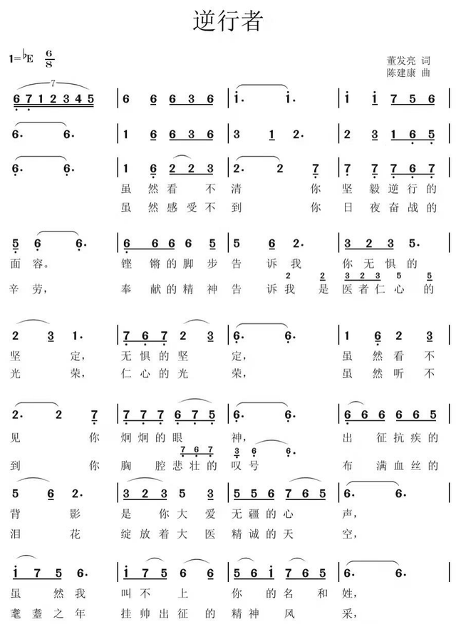 歌曲《逆行者》由董发亮作词,陈建康作曲,周澎演唱。疫情就是命令,防控就是责任,疫情来临时,涌现出千千万万个不顾自身安危、奋战在抗疫一线的“逆行者”,他们守护着人民的安危,是人民心中最美的英雄。歌曲《逆行者》歌颂了他们大无畏的崇高奉献精神。
