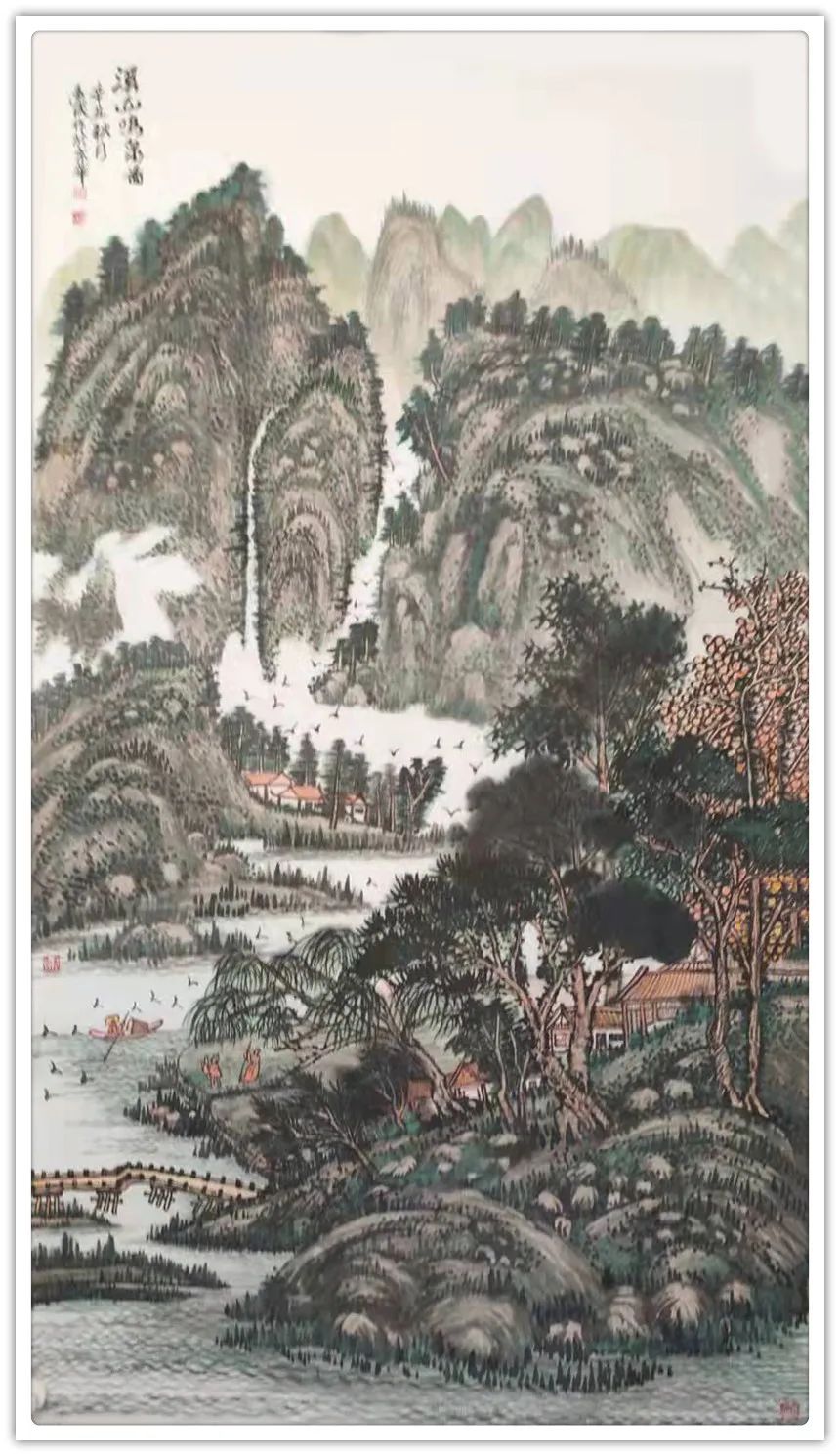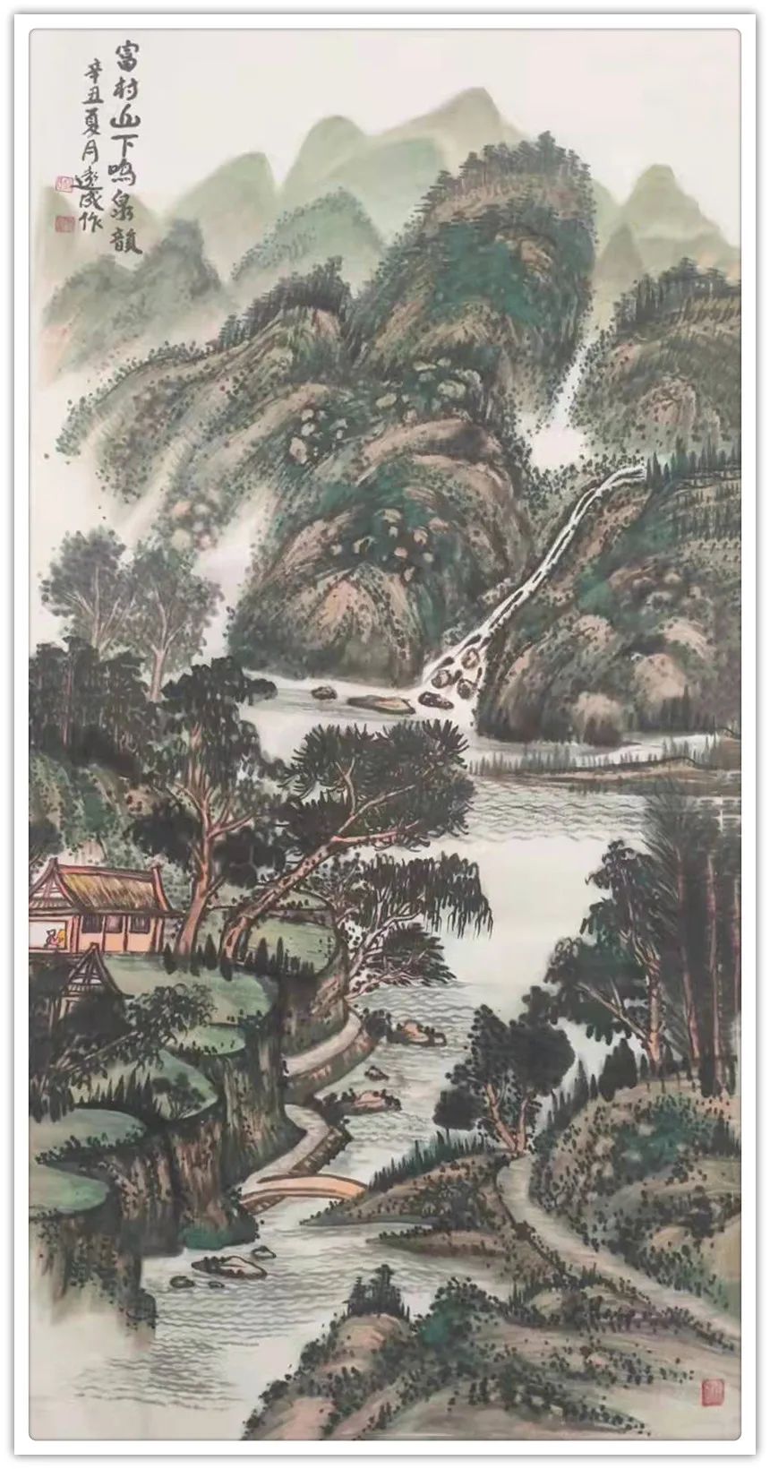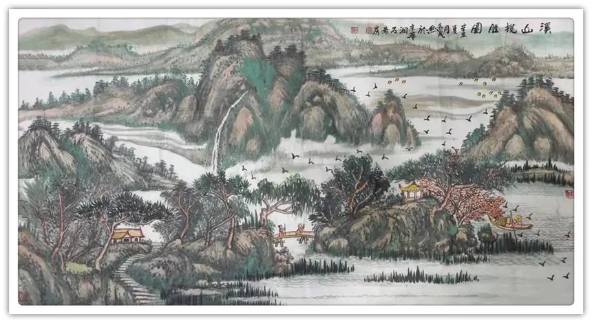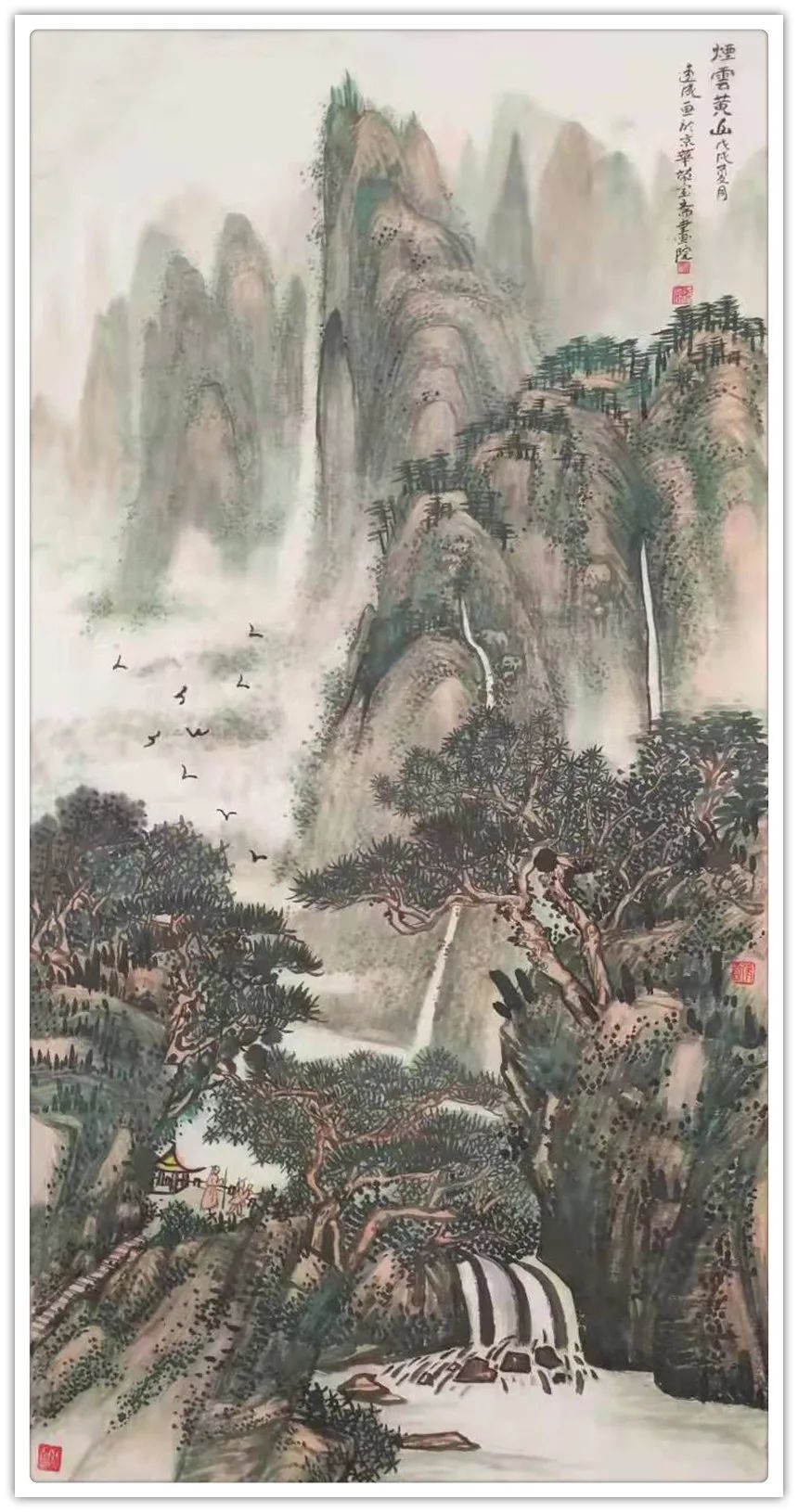 如在作品中,远天灰蒙,几座苍劲古拙造型生动的大山矗立在半空中,苍翠幽壑、云雾萦绕,两侧对峙的山峰起伏不断。山腰处若隐若现的飞檐翘角的房舍,也许,那就是“钓者沽酒”的人家。画家如此巧妙的安排,追求的就是一种心灵的安宁、一种灵魂本真的回归。而山涧灵巧清丽自由飞翔的几只珍鸟,又为画面增添了非凡气势,大有蓬莱之境令人心驰神往。在这幅作品中先生动静结合,远山雄浑壮阔,近景润泽清新,让人领悟自然本真的同时更有物我一体的精神境界。