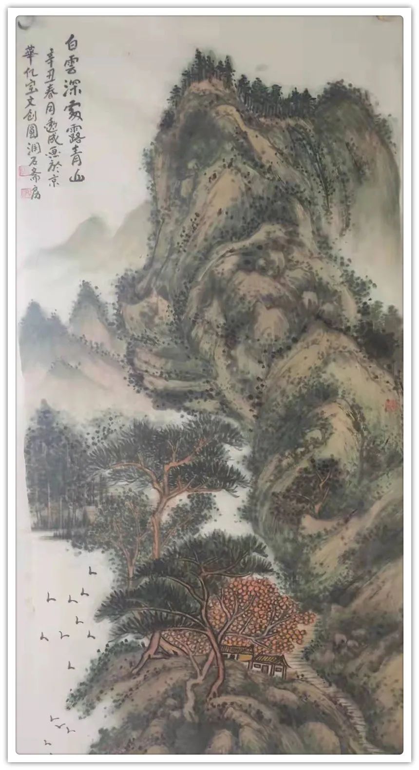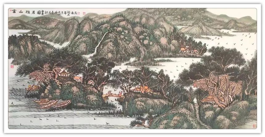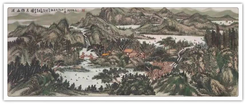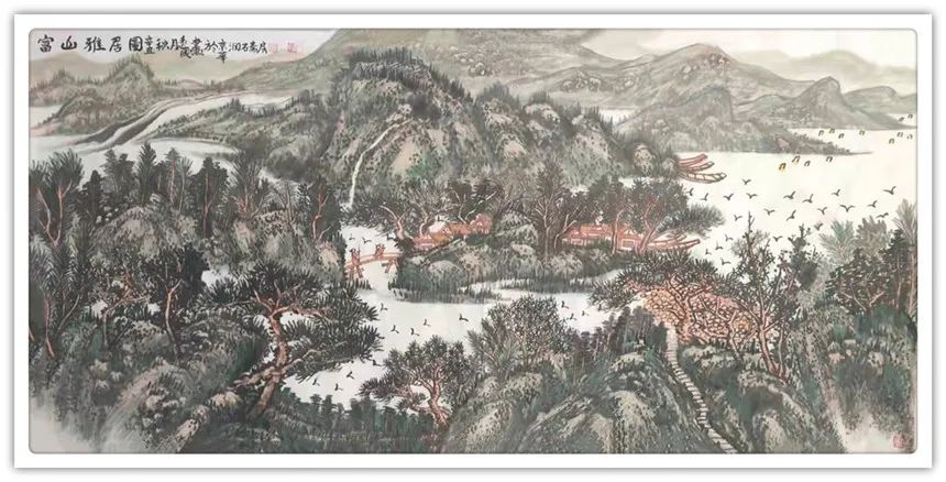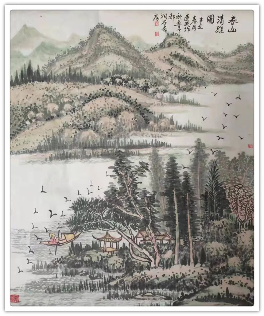 如在作品中,远天灰蒙,几座苍劲古拙造型生动的大山矗立在半空中,苍翠幽壑、云雾萦绕,两侧对峙的山峰起伏不断。山腰处若隐若现的飞檐翘角的房舍,也许,那就是“钓者沽酒”的人家。画家如此巧妙的安排,追求的就是一种心灵的安宁、一种灵魂本真的回归。而山涧灵巧清丽自由飞翔的几只珍鸟,又为画面增添了非凡气势,大有蓬莱之境令人心驰神往。在这幅作品中先生动静结合,远山雄浑壮阔,近景润泽清新,让人领悟自然本真的同时更有物我一体的精神境界。