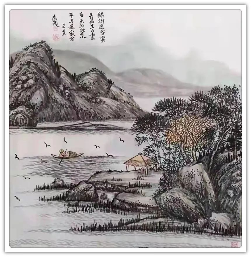 一山一水、一丘一壑、微波荡漾、构图开合有度,先生用笔清淡设色雅致自有朦胧的云水之意。近景、远景、中景浑然一体画面气势恢宏,尽显祖国大好山河的辽阔与壮美。群山绿水之间,点点轻舟,又有纵横大美天地的大千气象。其实,杨先生创作的这些山水作品早已超出了一般现实意义的山水,他是在掌握传统笔墨精髓的同时又追求的中国画中的画中有诗,诗中有画的高境界、高品位,我想他的成功之处就是追求笔外之笔,墨外之墨,境外之境。