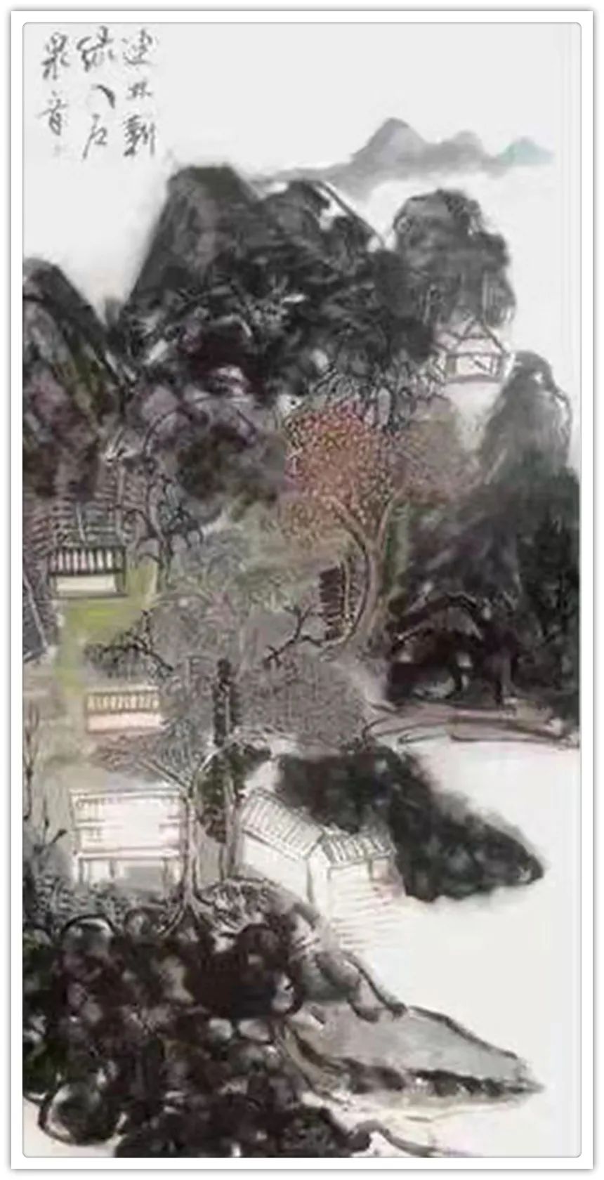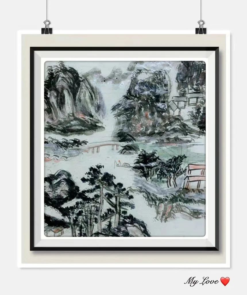 他的国画构思巧妙、色彩淡雅、用笔简约、意境深远,如他的国画作品《山居图》、《春风又绿江南岸》、《鸟鸣自乐》、《远瞩》、《野渡无人舟自横》、《山青鸟飞回》,其中,他的作品《老山林外》,画面表现了在群山密林之中,有几间民宅若隐若现,山脚下,一湾江水缓缓流过,江上一叶扁舟正悠闲自得的划行。仿佛观者身处其境,不能自拔。