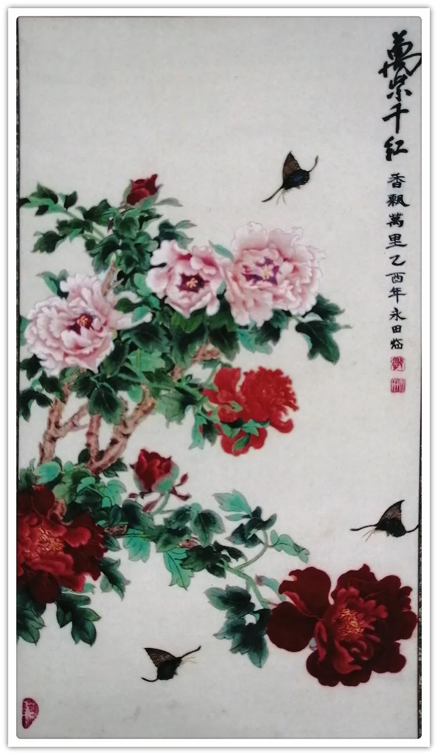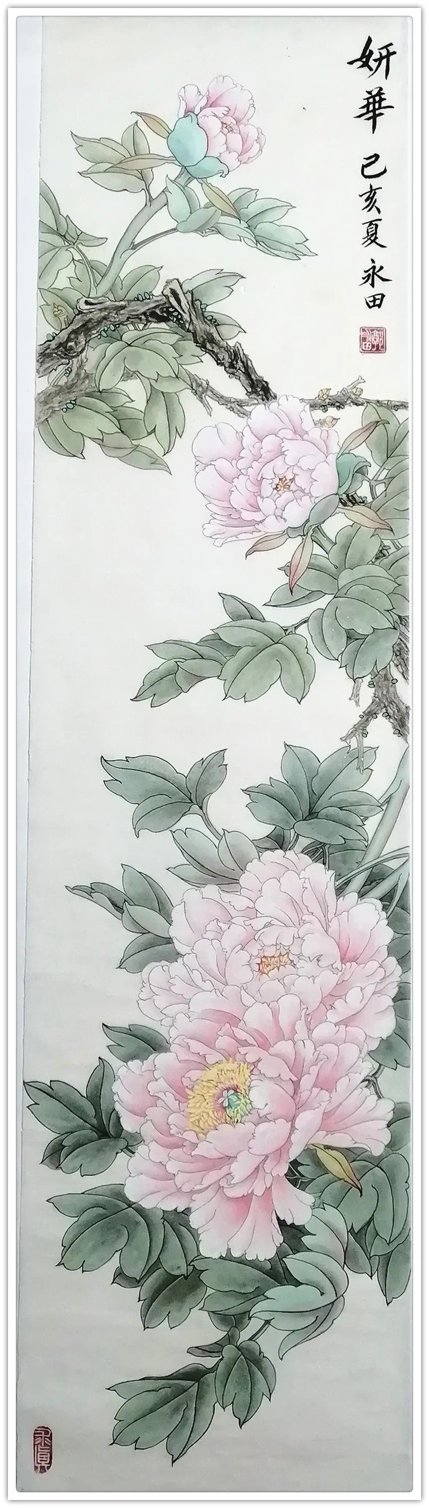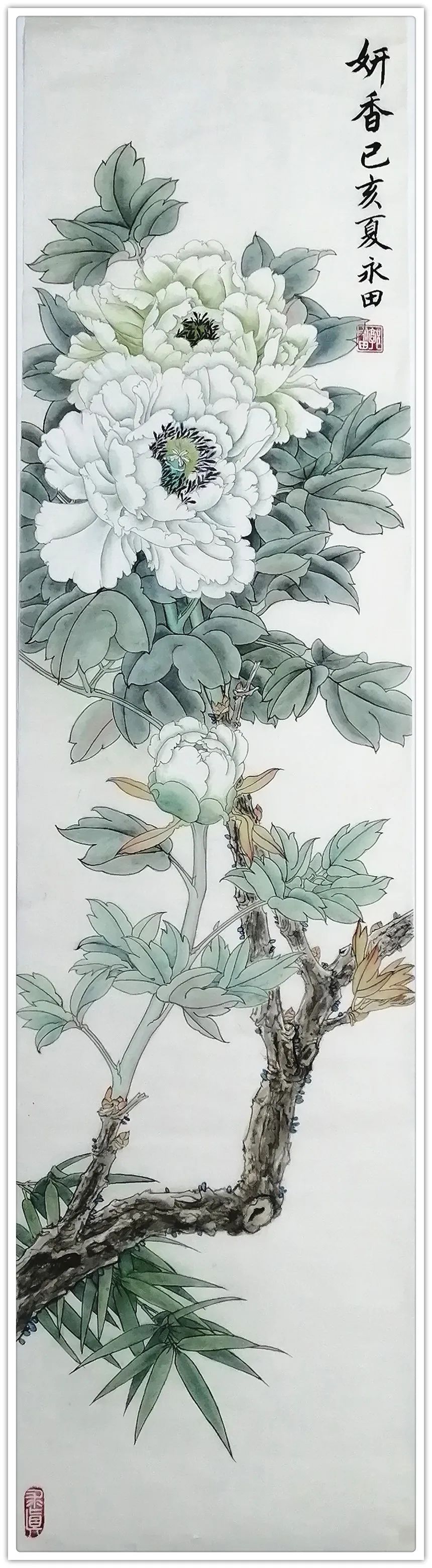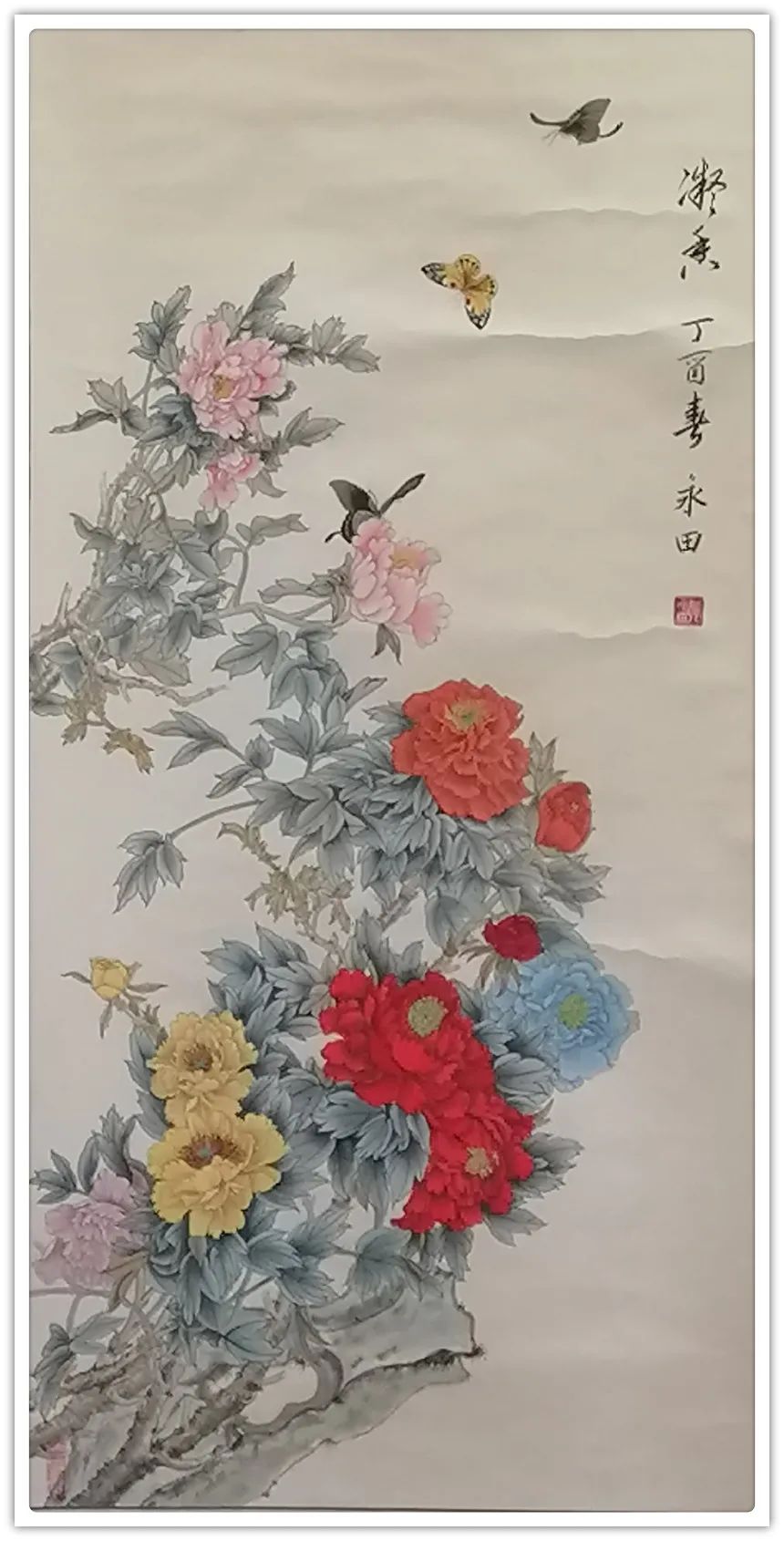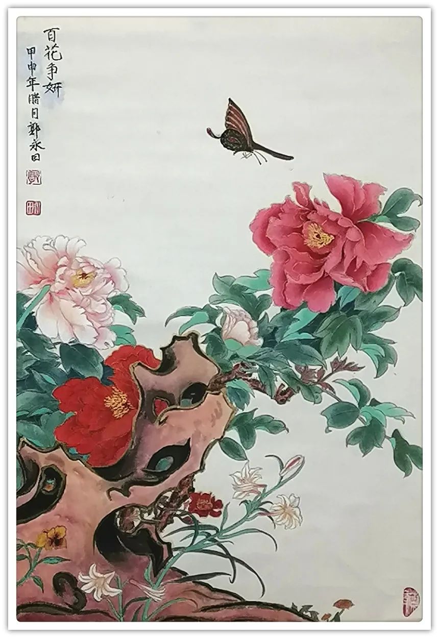 郭永田老师坚持深入生活写生创作,对于花、鸟、树、石、蜂、蝶的造型,有深入的研究和表现。她重视写生观察,采撷于自然的花卉形象,研究自然环境中花鸟的物理、物态和物情。她善于从生活中采撷素材、从自然景观中重构笔墨形式,寻找新的艺术表现,《凝香》、《芳华》均是写生得稿,折枝构图中体现的完全是大自然满目春色的直观感,添上一抹掠过的蝶影,显示出独创的奇趣。传统花鸟画的严格法度和完美程式,结合当代特有的明朗格调和饱满的激情,构成了郭永田老师工笔花鸟画的特有风格,她的作品既清新隽逸为人们所共赏,又雍容华贵为大众所喜爱。