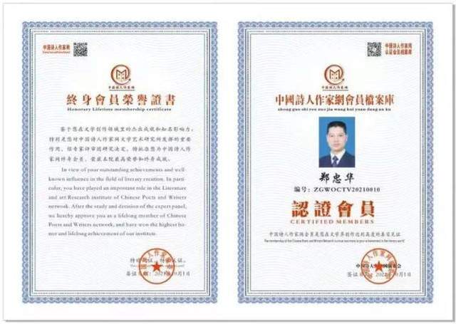 现为:中国教育学会会员、中国书法家协会会员、中华诗词学会会员、中国楹联学会会员、中国书画家协会副会长、中国国画院书法研究院秘书长、中国剑光书画院理事、中国新时代档案库会员等。书法作品入编《走进艺术大师》、《中国文化艺术人物年鉴》、《中国当代文艺名家名作年鉴》、《大国崛起》等几十本书籍,诗词作品入编《中国当代诗歌大辞典》、《中国当代爱情诗歌精选》、《中华诗词集萃》、《中华诗词歌赋文学精英大辞典》、《四十年华语文坛精品汇编》、《诗中国杂志》第40期、《韵墨情雨三部曲*千里思乡情》、《中国现当代作家诗人大词典》、《感动城市的最美诗文》、《中国抗击“冠状病毒”网络前沿诗文典藏》、《感动中国的醉美诗文》、《中国网络诗歌年选2019》、《中国二十世纪诗歌备忘录》、《中国网络诗歌年选2020》、《世界名人录》、《中国当代传世诗文大辞典》、《共和国诗人》、《建党百年.文坛先锋作品珍藏版》等书籍。部分作品在《当代文学集萃》、《燕京文化交流》、《文学中国》、《中华诗歌报》等网络平台发表。出版书籍有《郑忠华书法作品集》、《诗意人生--郑忠华诗文精选》。有网络作品推广《诗意人生——郑忠华诗文第一部》、《诗意人生——郑忠华诗文第二部》、《诗意人生——郑忠华诗文第三部》、《诗意人生——郑忠华诗文精选(50首)》、《为生命创造奇迹——郑忠华诗文选》、《郑忠华散文网络展》、《郑忠华诗文、书法作品联展》、《2019年郑忠华诗词散文》、《2020年郑忠华诗词散文》、《生命的轨迹——郑忠华诗文选》、《让生命充满色彩——郑忠华诗文选》、《2011年之前的诗——郑忠华诗文》、《郑忠华诗文音频制作选用(43首)》《做最出色的自己——郑忠华诗文欣赏(50首)》、《活出人生的精彩——郑忠华诗文欣赏(50首)》、《好好爱自己——郑忠华诗文欣赏(50首)》、《鹰的重生——郑忠华2021诗文欣赏(50首)》、《最美的遇见——郑忠华诗文欣赏(50首)》、《是鹰就得飞翔——郑忠华2021诗文欣赏(50首)、《舞出人生的精彩——郑忠华2021年经典诗文欣赏(76首)》。百度搜索:郑忠华诗文、郑忠华书法。