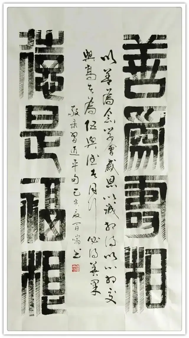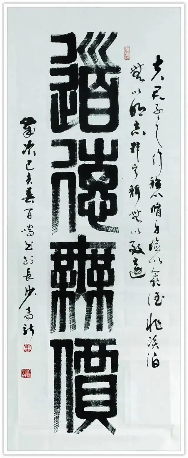 篆笔若断古刀,水墨传颂伟人。在书画艺术上,先生溯本清源,体悟意象,其作品既师传统,亦师古今,更师自然与造化,在传承经典的基础上,加以开拓创新,为翰墨与丹青呈现出了的新时代的艺术表现力,同时未来的书画艺术也必是由此而生,由此而继,可以说这是必然的,也是成功的!致敬先生的功德才技,已是不言而喻也!