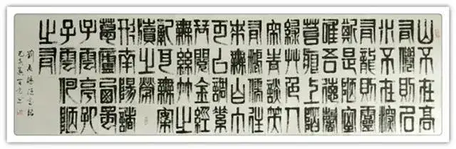 书法有高论,笔法方入不扁平刻板,圆入不臃肿呆滞,乃高手也。在其书法作品中,我最欣赏先生的篆书之作,可谓是独具匠心,将方笔运用到了极致,其用笔露锋起笔,落纸铺毫,侧重顿,笔外拓,行笔沿中,方棱转折,相应欹斜,紧接配合捻转调锋,而后露锋收笔。直至笔画端头也,通篇下来一丝不苟,浑劲强雄,笔笔线条折如刀,断如戟,凝整沉着,墨融筋劲,完全是笔方而意圆,体方而势圆,翰墨精华,唯此是也!